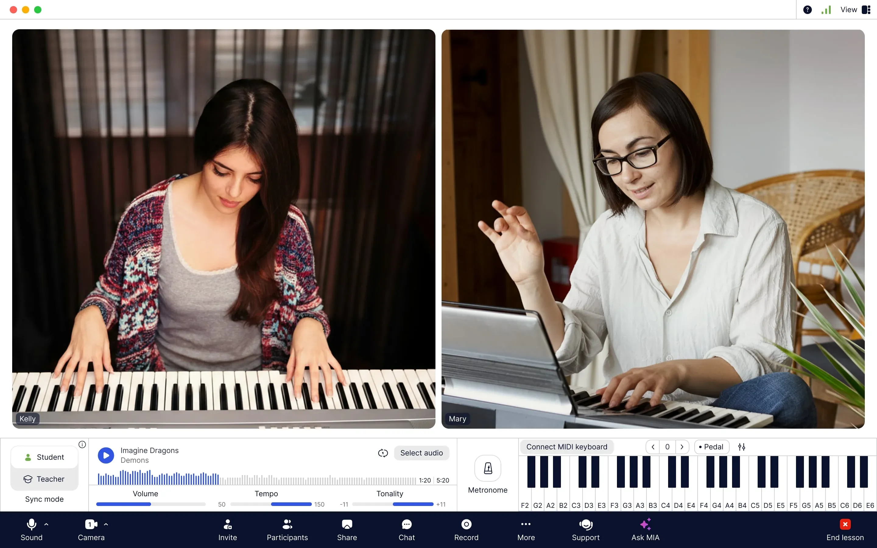 - Built-In Music Tools: Use a professional metronome and full virtual piano (+ MIDI support) directly in the lesson space.